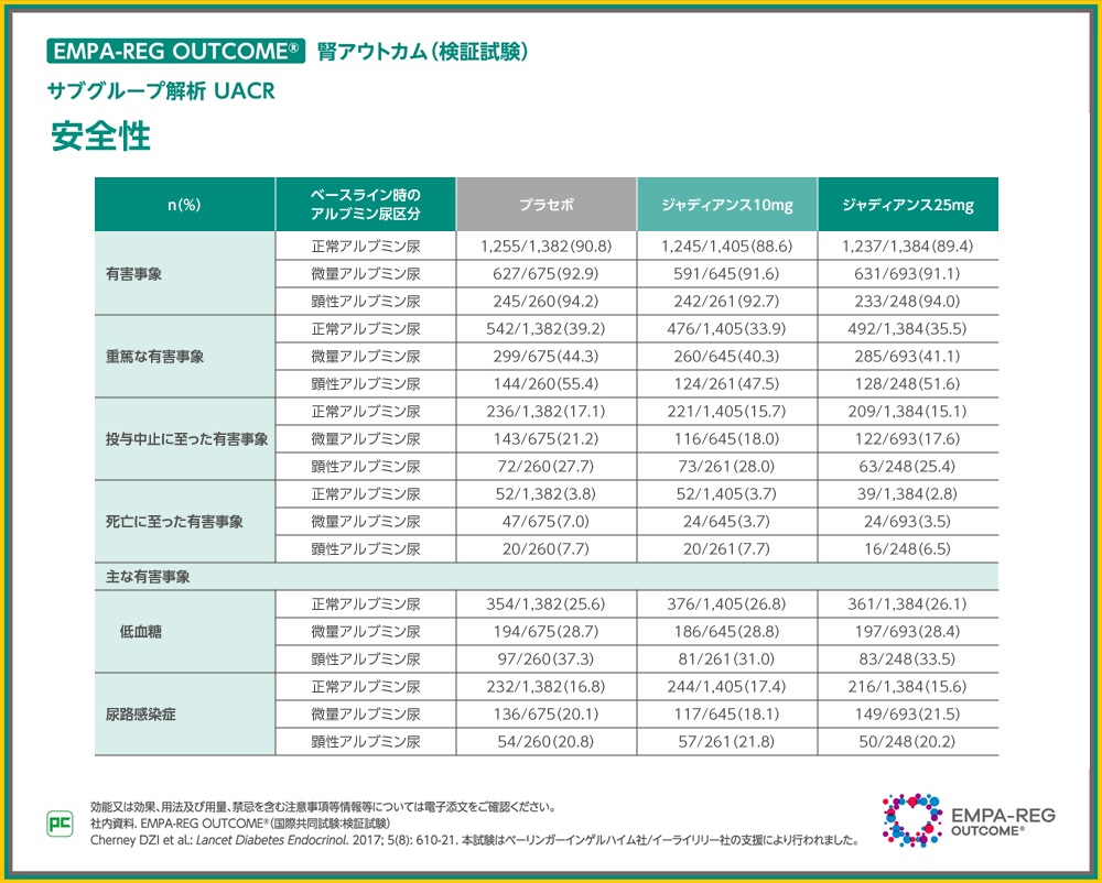 本試験での有害事象の発現率は、全体集団のジャディアンス10mg群で90.1%(2,112/2,345例)、25mg群で90.4%(2,118/2,342例)、プラセボ群で91.7%(2,139/2,333例)でした。本解析における有害事象は、ベースライン時に正常アルブミン尿の患者において、プラセボ群90.8%(1,255/1,382例)、ジャディアンス10mg群88.6%(1,245/1,405例)、ジャディアンス25mg群89.4%(1,237/1,384例)、ベースライン時に微量アルブミン尿の患者において、プラセボ群92.9%(627/675例)、ジャディアンス10mg群91.6%(591/645例)、ジャディアンス25mg群91.1%(631/693例)、ベースライン時に顕性アルブミン尿の患者において、プラセボ群94.2%(245/260例)、ジャディアンス10mg群92.7%(242/261例)、ジャディアンス25mg群94.0%(233/248例)に認められました。