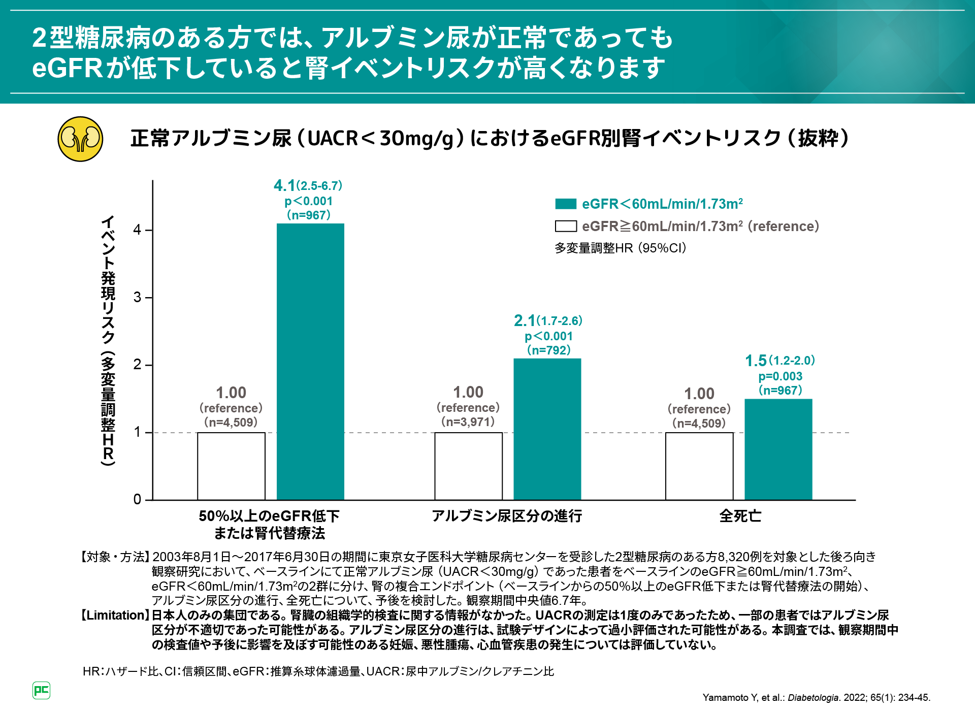 さらに、アルブミン尿が正常な2型糖尿病のある方を対象に予後を検討した後ろ向き観察研究の結果、eGFR<60mL/min/1.73m2群では、eGFR≧60mL/min/1.73m2群と比較して、50%以上のeGFR低下または腎代替療法導入リスクが4.1倍、アルブミン尿区分の進行リスクが2.1倍に上昇することが報告されました。