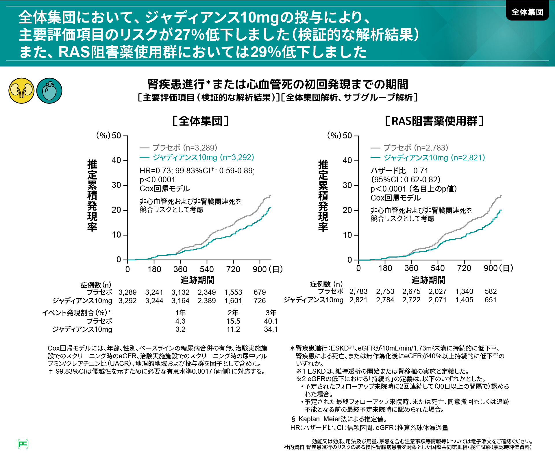 本試験では、全体集団において、ジャディアンス10mgの投与により主要評価項目(腎疾患進行または心血管死)のリスクが27%低下しました(99.83%CI:0.59-0.89、p<0.0001、Cox回帰モデル)(検証的な解析結果)。