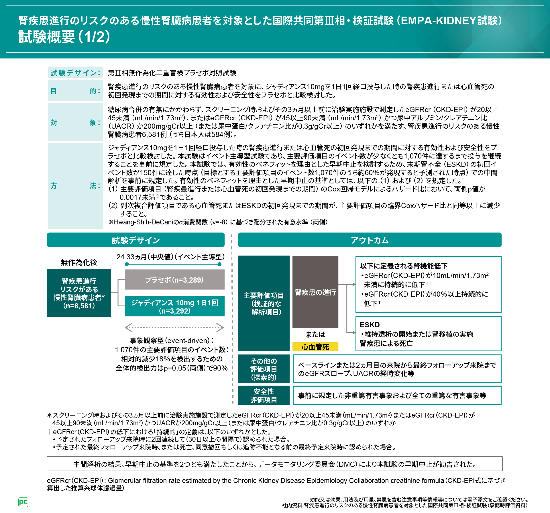 本試験は、腎疾患進行のリスクのあるCKD患者6,581例を対象に、ジャディアンス10mgを1日1回経口投与した時の腎疾患進行または心血管死の初回発現までの期間に対する有効性および安全性をプラセボと比較検討しました。また、対象患者のうち584例が日本人でした。