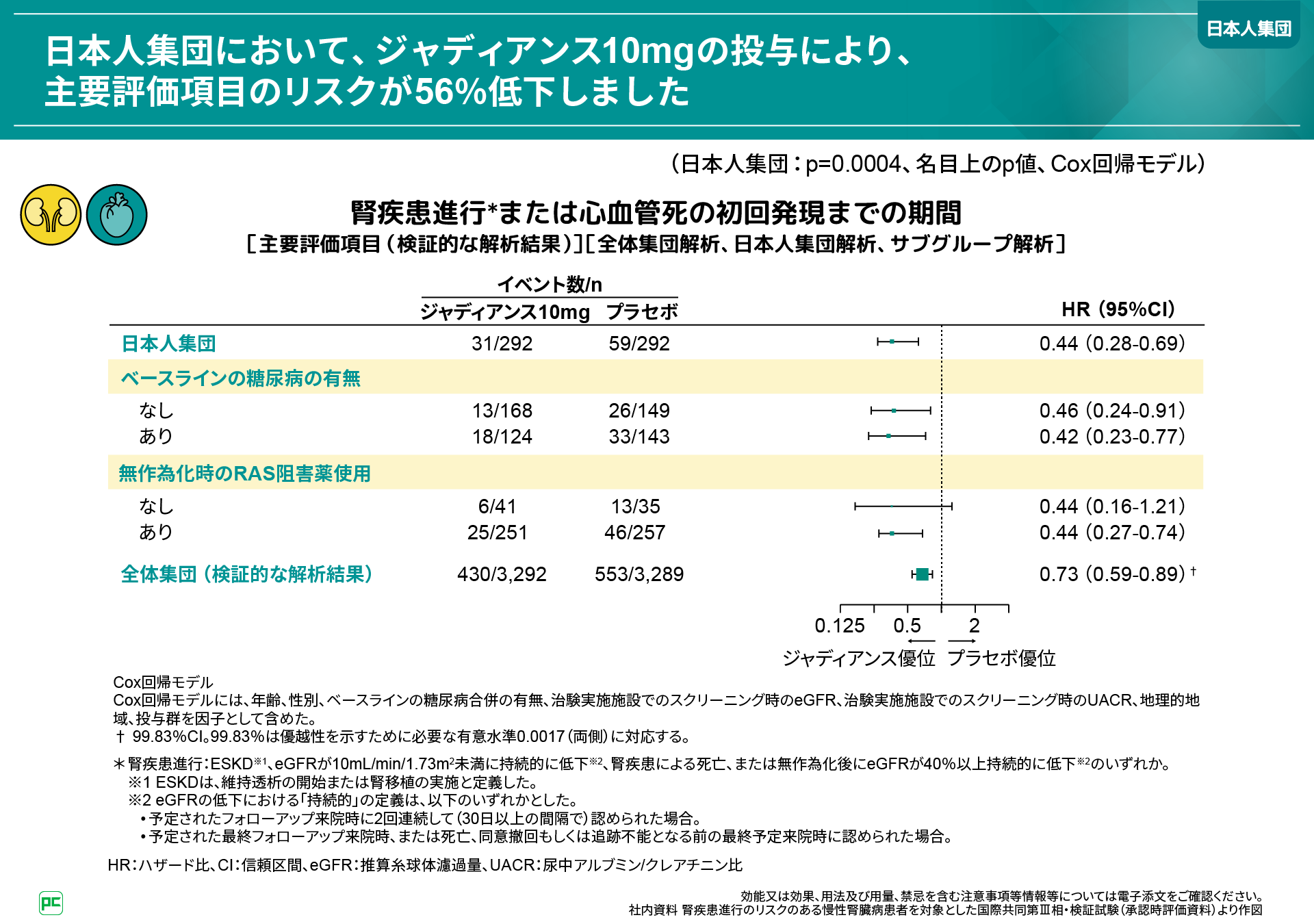 さらに日本人集団では、ジャディアンス10mgの投与により、主要評価項目のリスクが56%低下しました(95%CI:0.28-0.69、p=0.0004、名目上のp値、Cox回帰モデル)。