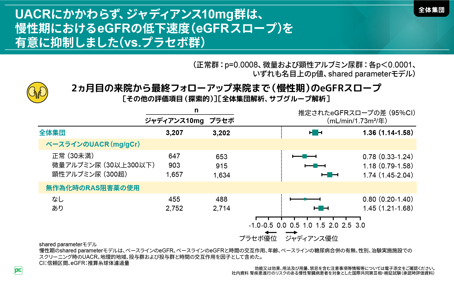 その結果、UACRにかかわらず、ジャディアンス10mg群はプラセボ群と比べて、慢性期におけるeGFRスロープを有意に抑制しました(正常群:p=0.0008、微量および顕性アルブミン尿群:各p<0.0001、いずれも名目上のp値、shared parameterモデル)。