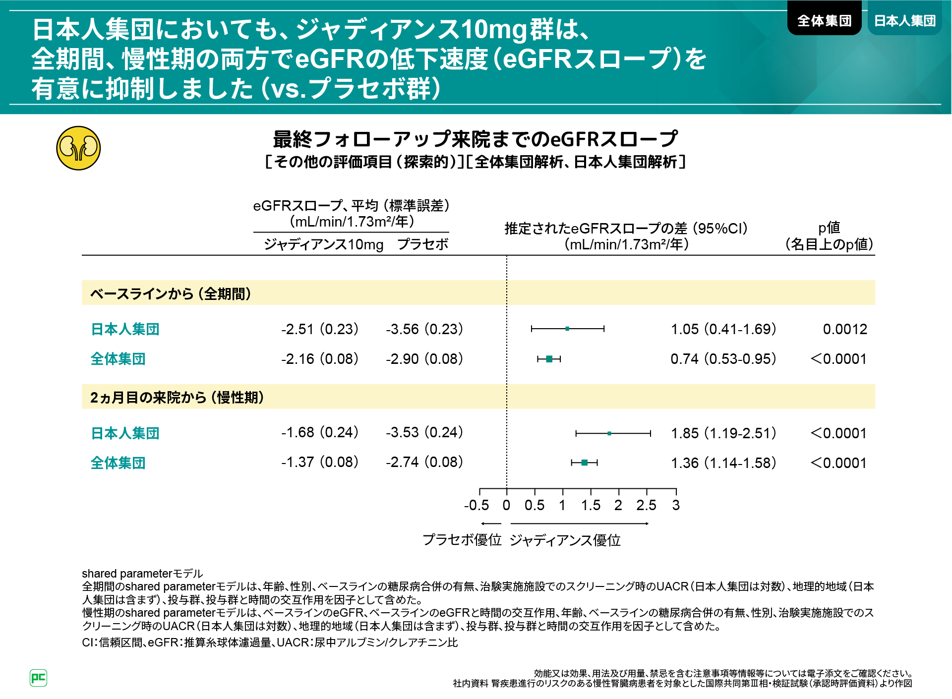 さらに、日本人集団においても、ジャディアンス10mg群はプラセボ群と比べて、全期間、慢性期の両方でeGFRスロープを有意に抑制しました(全期間:p=0.0012、慢性期:p<0.0001、いずれも名目上のp値、shared parameterモデル)。