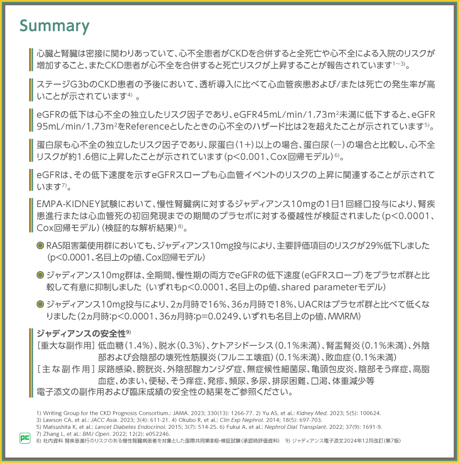 ジャディアンスは、2型糖尿病の有無を問わず、進行性の慢性腎臓病患者を対象としたEMPA-KIDNEY試験において、1日1回経口投与による有効性と安全性を検討したSGLT2阻害薬です。