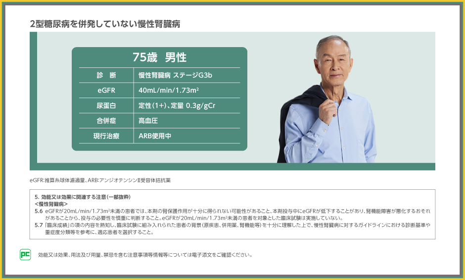 こちらの患者さんは、eGFR 40mL/min/1.73m2、ステージG3b、尿蛋白定性(1+)で慢性腎臓病と診断されています。2型糖尿病は併発していません。