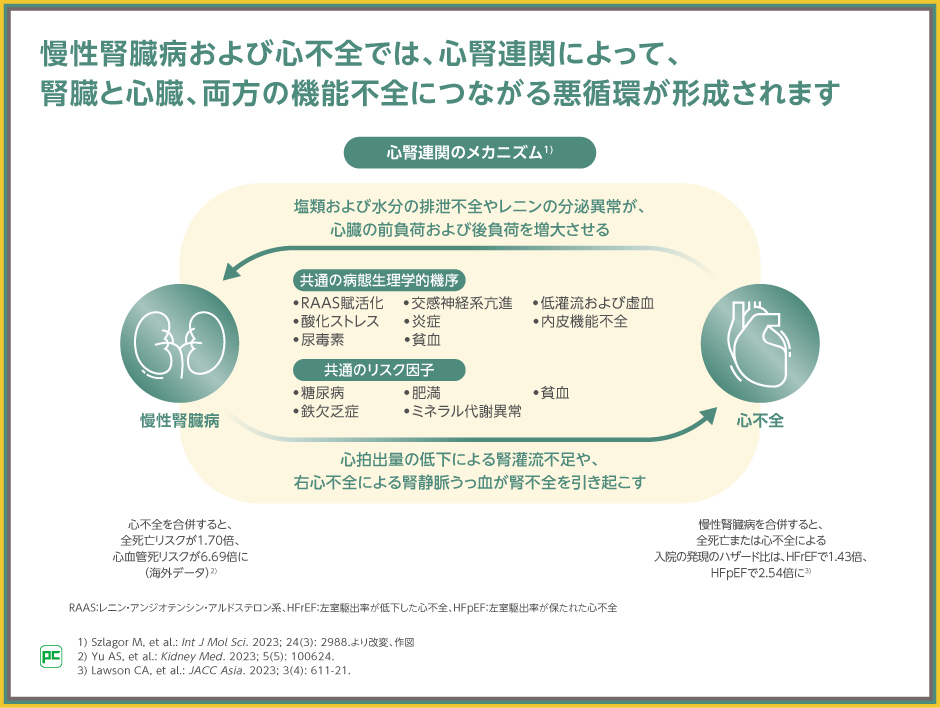 心臓と腎臓は密接に関わりあっていることから、心不全と慢性腎臓病は互いに悪影響を及ぼし、患者の予後の悪化を加速させます。