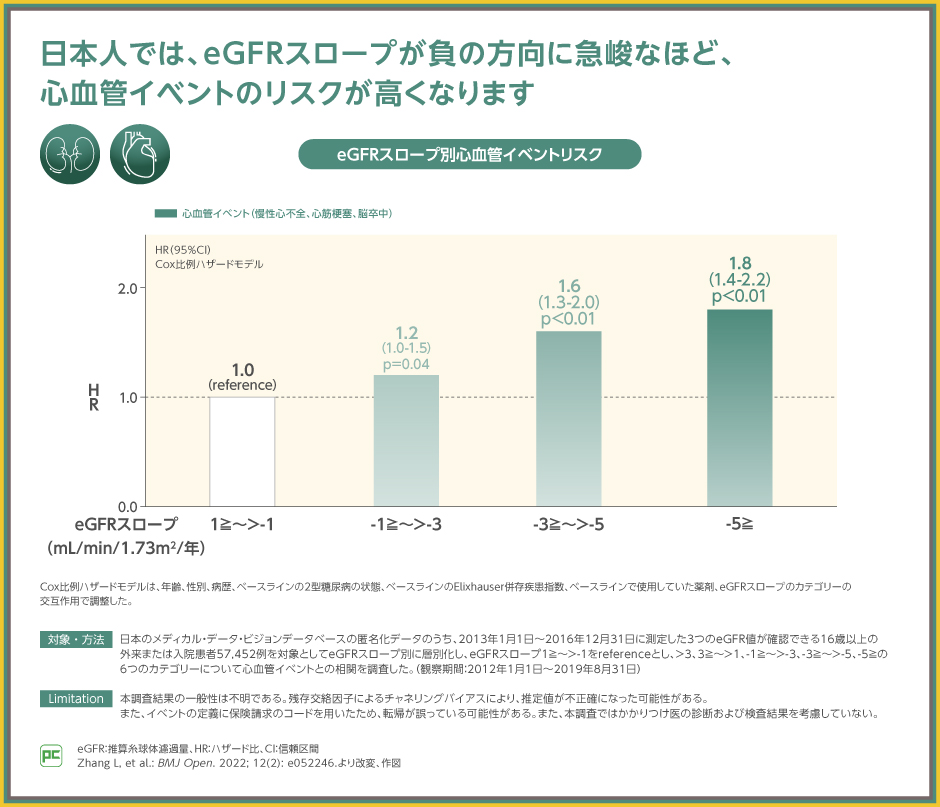 日本人を対象とした疫学調査では、eGFRスロープが急峻なほど(eGFRのスロープの負の値が大きいほど)、慢性腎不全を含む心血管イベントリスクが高いことが報告されています。