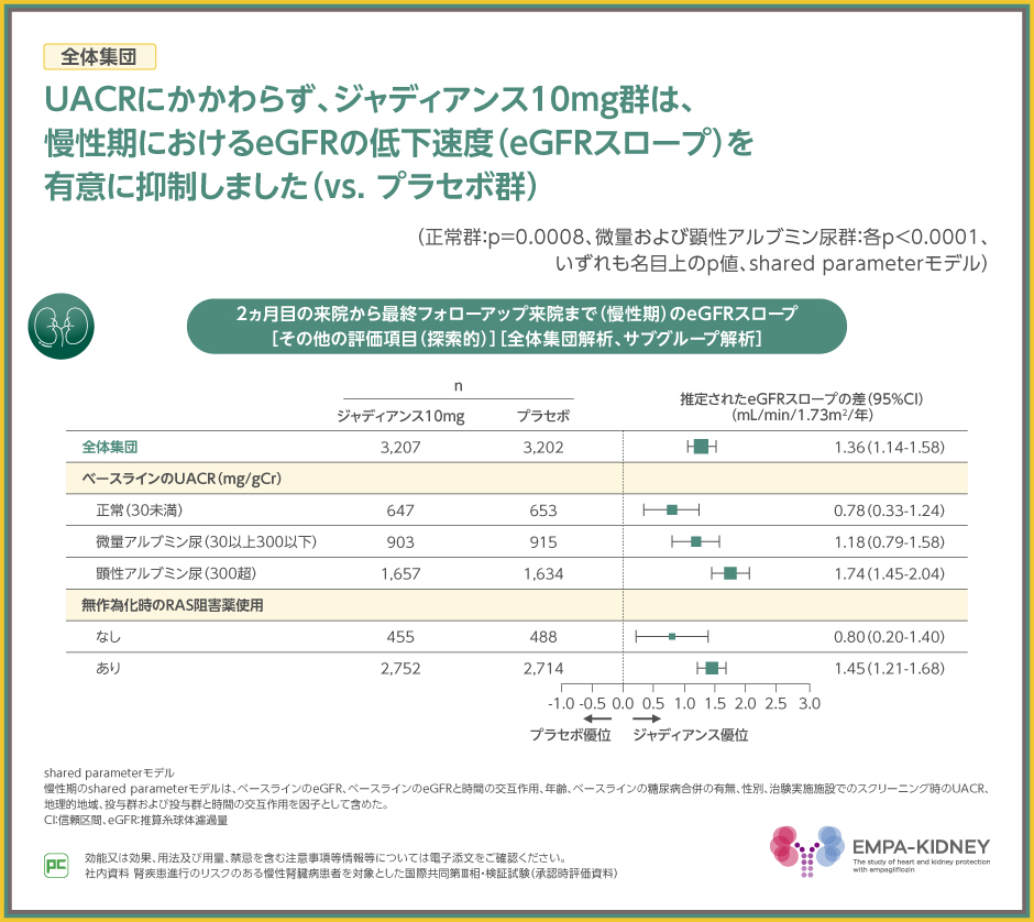 また、慢性期のeGFRスロープは、ジャディアンス10mg投与により、UACRの程度やRAS阻害薬の使用の有無にかかわらず有意に抑制されました(UACR正常群:p=0.0008、微量および顕性アルブミン尿群:各p<0.0001、RAS阻害薬の使用なし群:p=0.0087、RAS阻害薬の使用あり群:p<0.0001、いずれもvs. プラセボ群、名目上のp値、shared parameterモデル)。