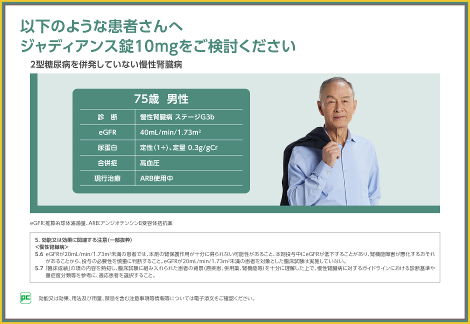 透析導入のリスクだけではなく心血管イベントリスクも考慮した慢性腎臓病※1治療の選択肢として、ジャディアンス10mgを、ぜひご検討ください。