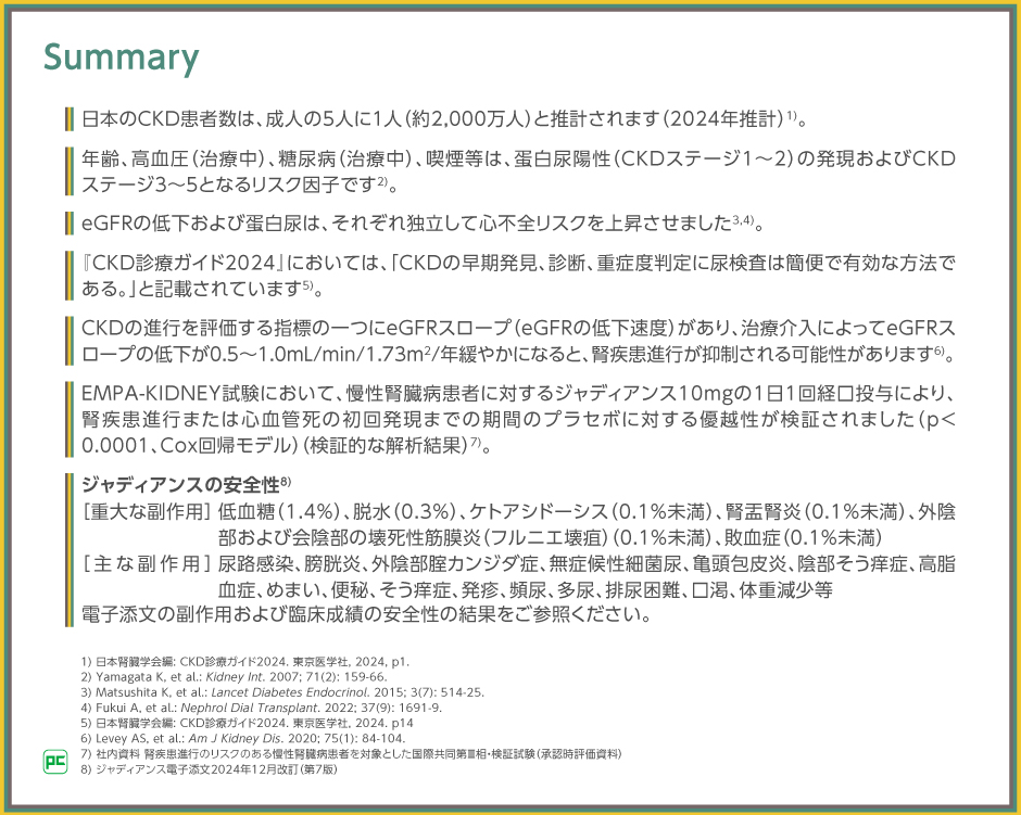 今回は、国内におけるCKD進行のリスク因子や評価指標を踏まえたCKD治療の考え方と、ジャディアンスの有効性をご紹介しました。