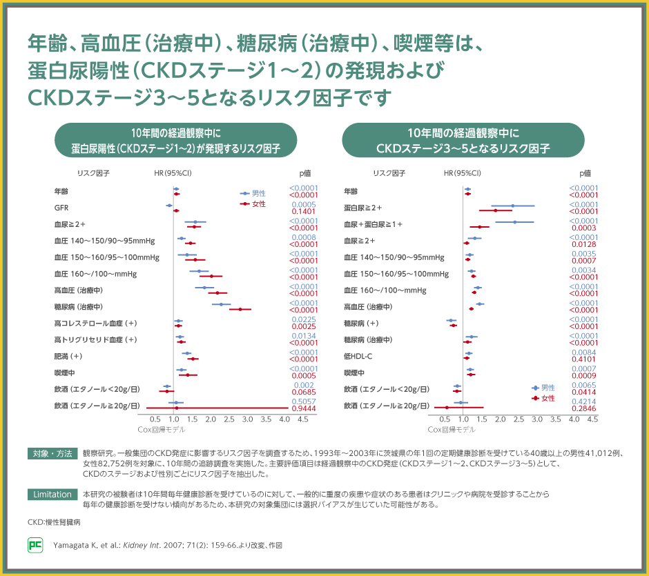 高血圧(治療中)、尿蛋白陽性は、CKD進行のリスク因子です