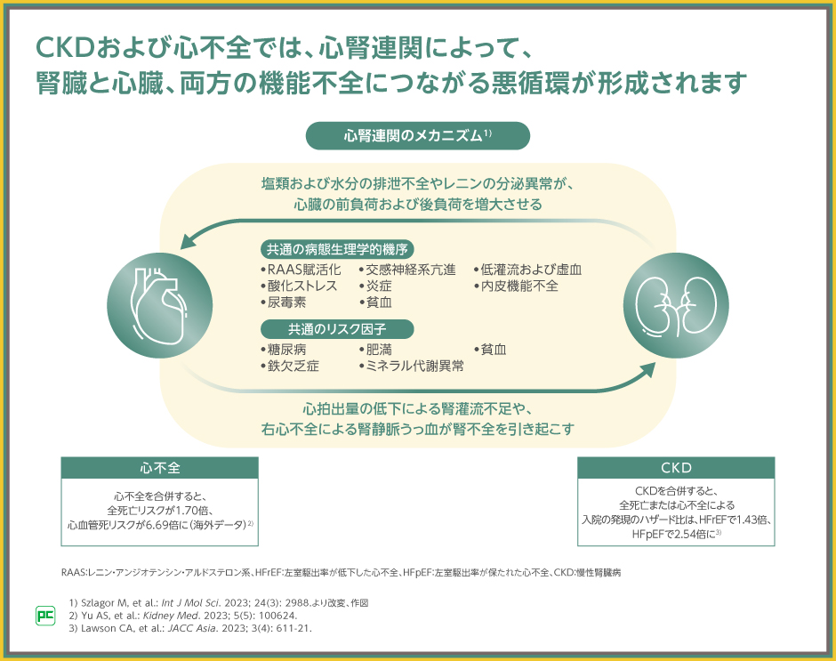 CKDは、心不全と共通のリスク因子および病態生理学的機序を持つことから、心腎連関によって、両方の疾患が増悪する悪循環が形成されます。