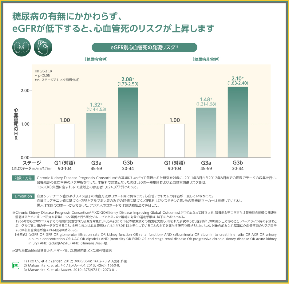 心イベントリスクは、糖尿病の有無にかかわらず上昇することが報告されており、糖尿病を併発していない群では、CKDステージG3aの場合、G1と比較した心血管死の発現リスクは1.48倍であったと報告されました。