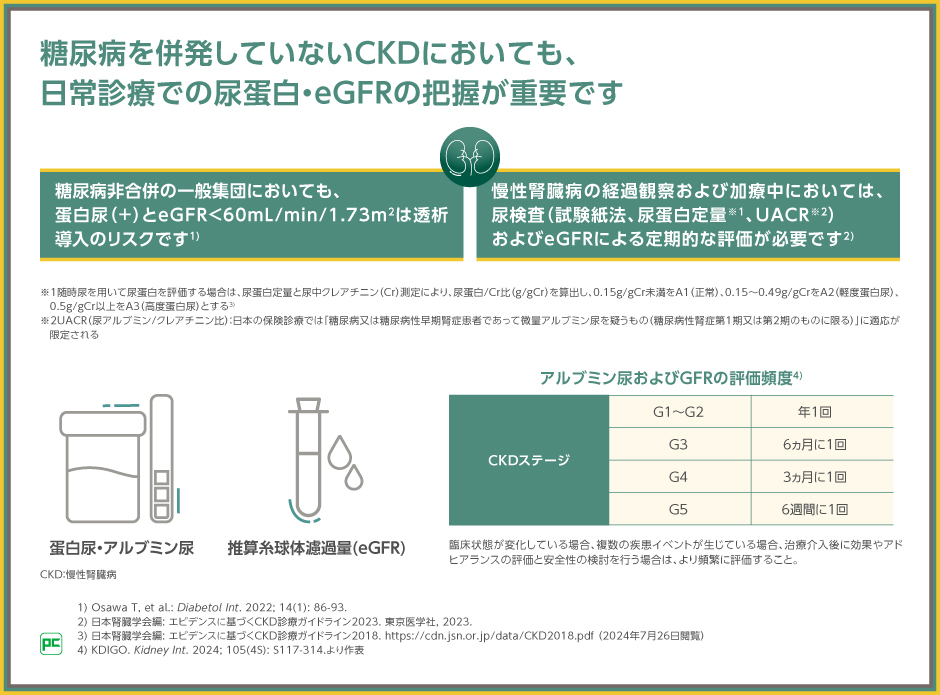 そのため、糖尿病を併発していないCKDにおいても、日常診療のルーティーンとして尿検査を実施して尿蛋白およびeGFRを確認し、早期からCKDの重症度を把握することが重要です。