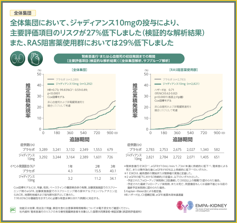 主要評価項目である腎疾患進行または心血管死のプラセボ群に対するジャディアンス10mg群のハザード比は0.73(99.83%CI:0.59~0.89)、p<0.0001(Cox回帰モデル)であり、ジャディアンス10mg群の優越性が検証されました。