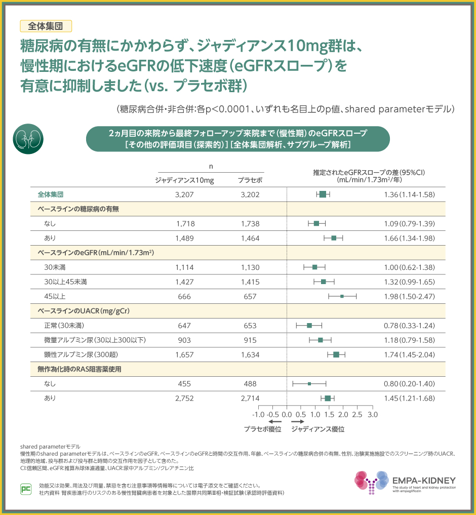 また、全体集団のサブグループ解析において、糖尿病の有無にかかわらず、ジャディアンス10mg群は、慢性期におけるeGFRの低下速度を有意に抑制しました(vs. プラセボ群、糖尿病合併・非合併:各p<0.0001、いずれも名目上のp値、shared parameterモデル)。