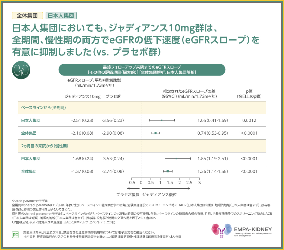 日本人集団での解析では、全期間、慢性期の両方で、ジャディアンス10mg群は、eGFRの低下速度を有意に抑制しました(vs. プラセボ群、慢性期:p<0.0001、全期間:p=0.0012、いずれも名目上のp値、shared parameterモデル)。