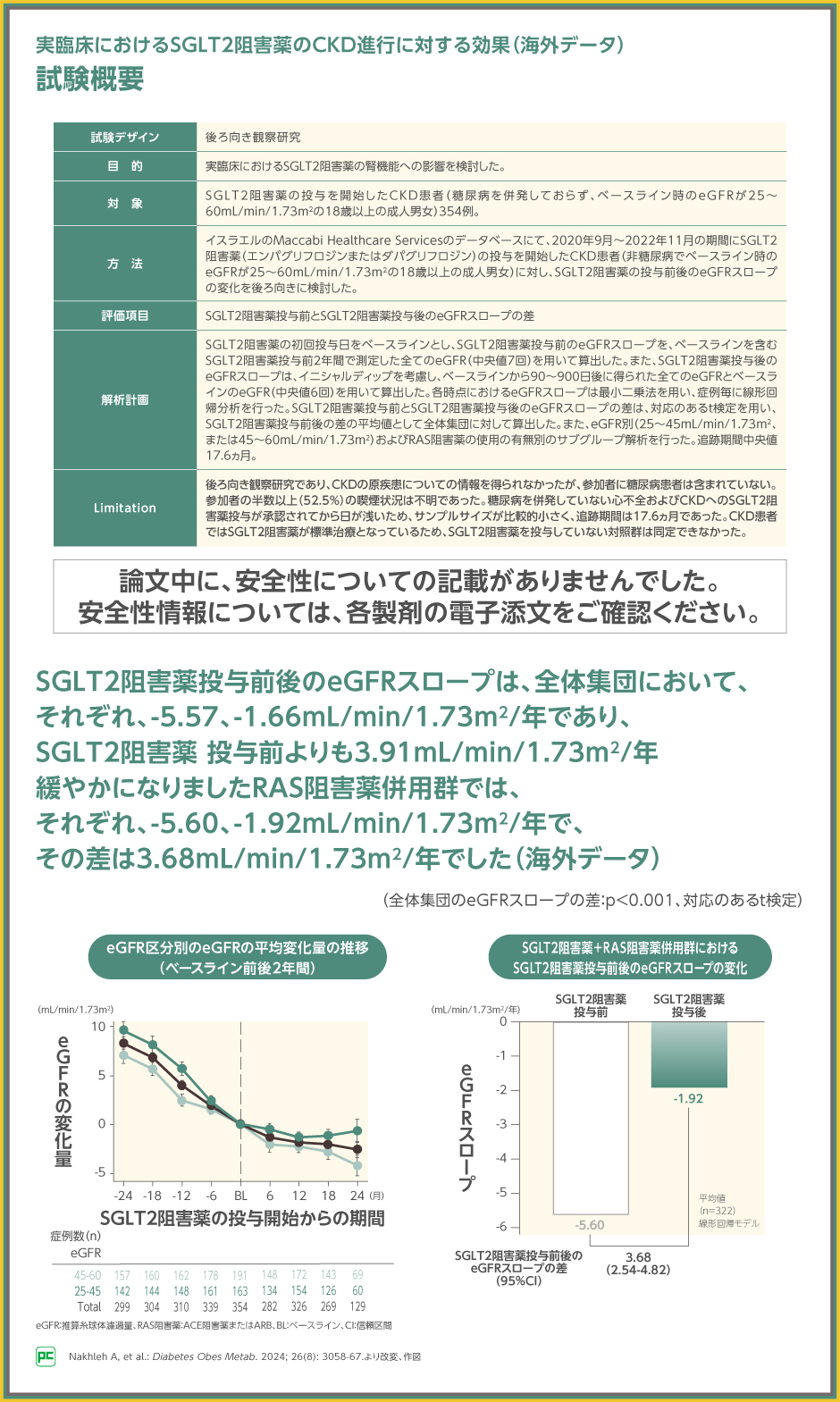 また、RAS阻害薬使用群に対してSGLT2阻害薬を追加投与した群(SGLT2阻害薬+RAS阻害薬併用群)におけるサブグループ解析では、SGLT2阻害薬投与前が-5.60mL/min/1.73m2/年、SGLT2阻害薬投与後が-1.92mL/min/1.73m2/年であり、SGLT2阻害薬投与前後の差は3.68mL/min/1.73m2/年でした。