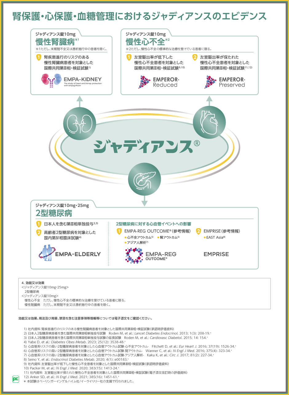 今回はジャディアンスの腎保護のエビデンスであるEMPA-KIDNEY試験をご紹介しましたが、心保護および血糖管理についてもジャディアンスの有効性と安全性が検討されていますので、これらの成績を踏まえて、実臨床でどのように役立てるべきか、ご検討ください。