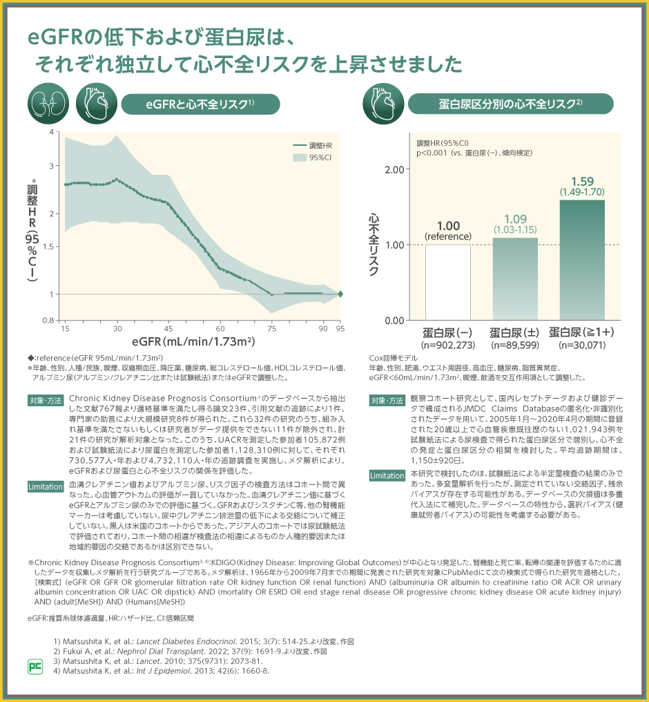 CKDの重症度にかかわるeGFRの低下と蛋白尿は、図のように、それぞれが独立した心不全リスクであることが示されました。