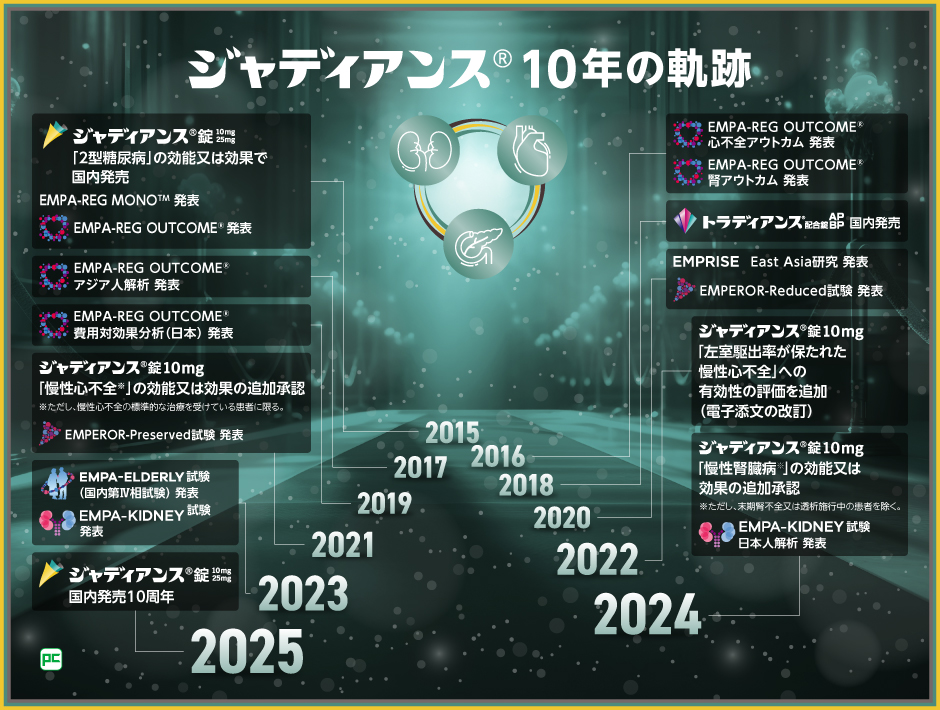 ジャディアンス錠10mg・25mgは、2015年に2型糖尿病の治療薬として国内で発売されました。その後、ジャディアンス錠10mgは2021年に慢性心不全※1、2024年に慢性腎臓病※2への効能又は効果、用法及び用量が追加承認されました。