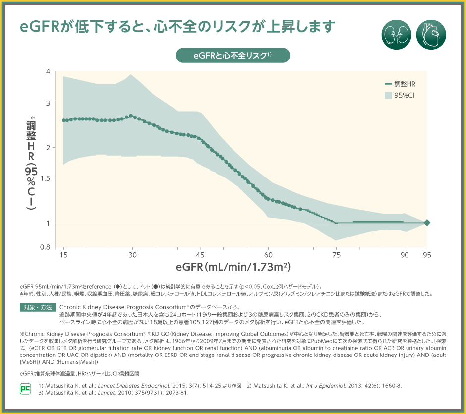 eGFRの低下は、心不全のリスク上昇と関連しています。