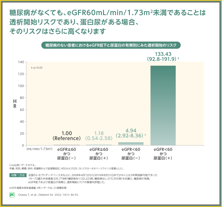 また、糖尿病のない患者でもeGFR60mL/min/1.73m2未満、すなわちeGFRがG3a以降であることは透析開始リスクであり、蛋白尿があると、さらにそのリスクが高くなります。