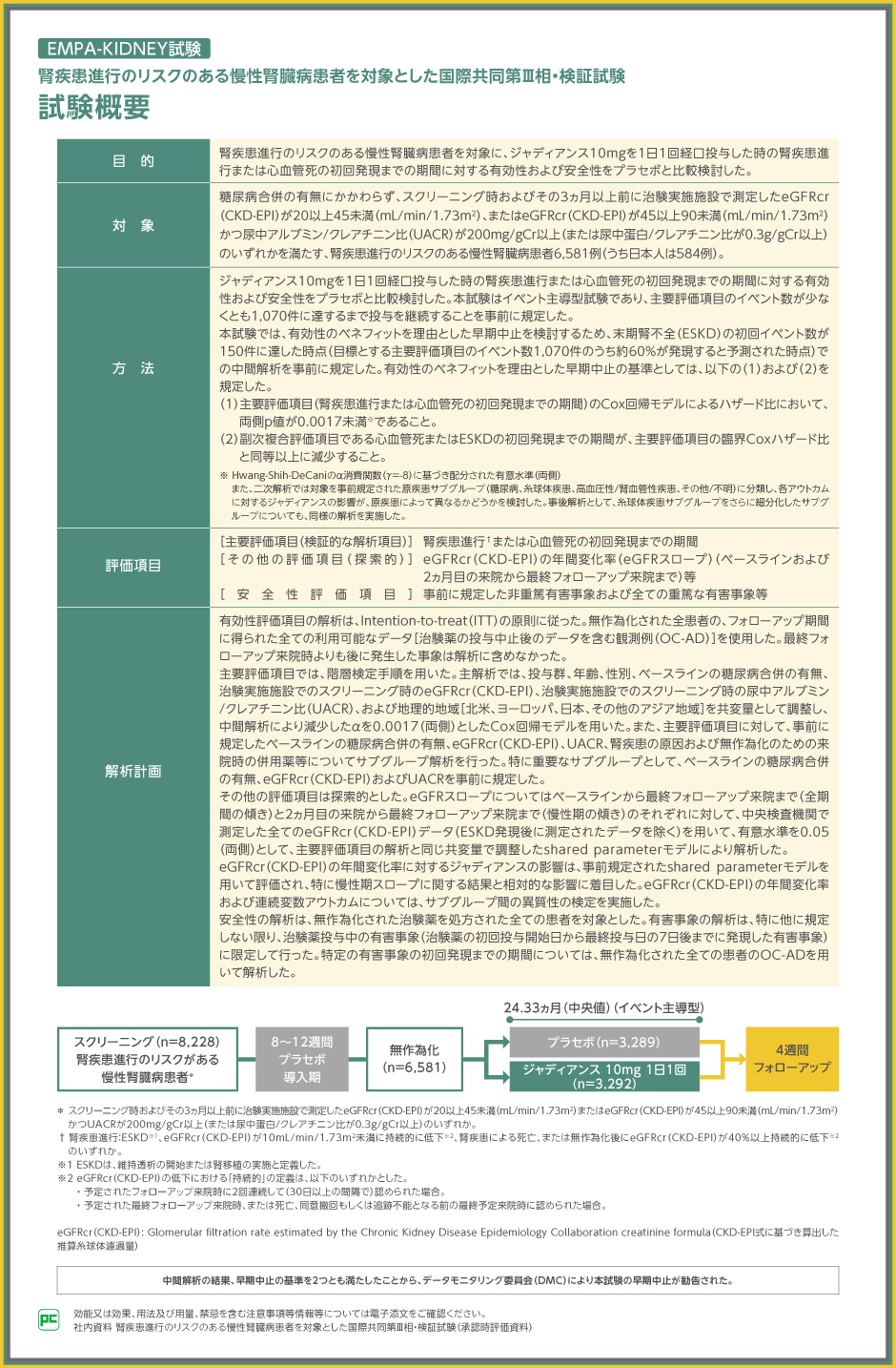 ジャディアンスは、EMPA-KIDNEY試験において糖尿病合併の有無を問わずCKD患者に対する有効性が示されました