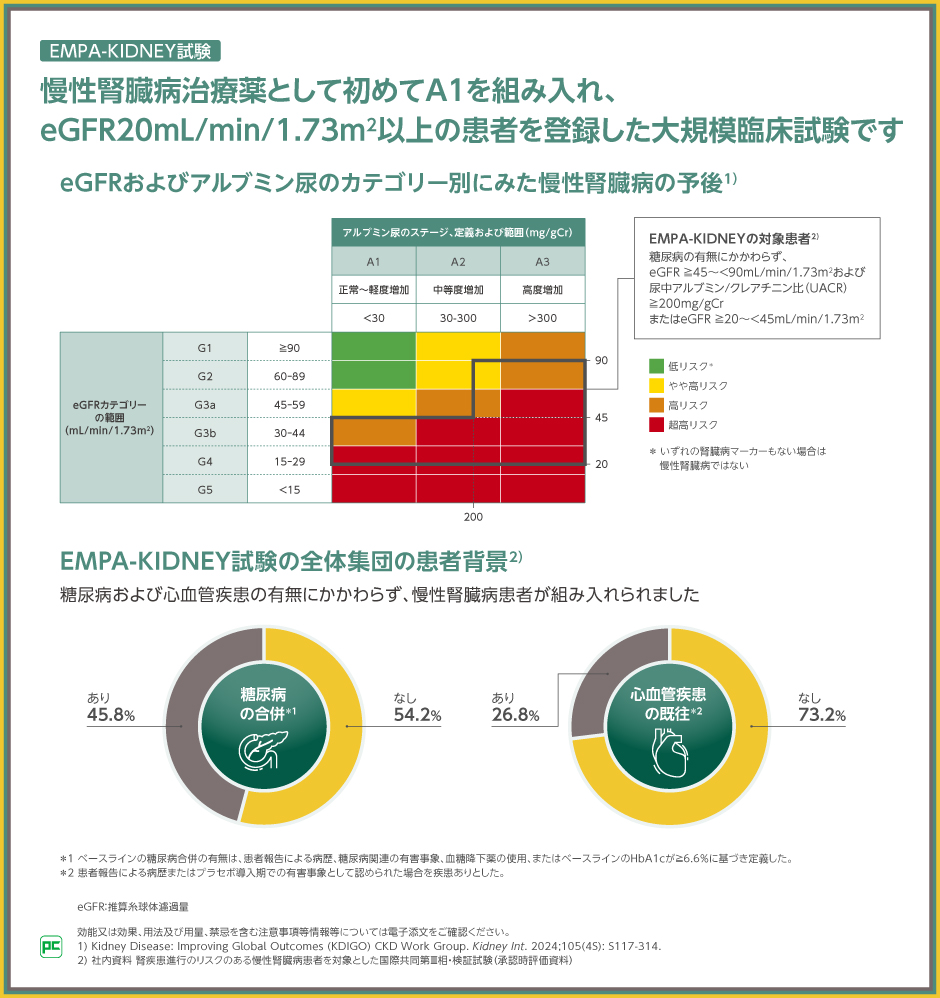 本試験は、CKD治療薬として初めてアルブミン尿30mg/gCr未満のA1患者を組み入れ、eGFR20mL/min/1.73m2以上の患者を登録した大規模臨床試験です。