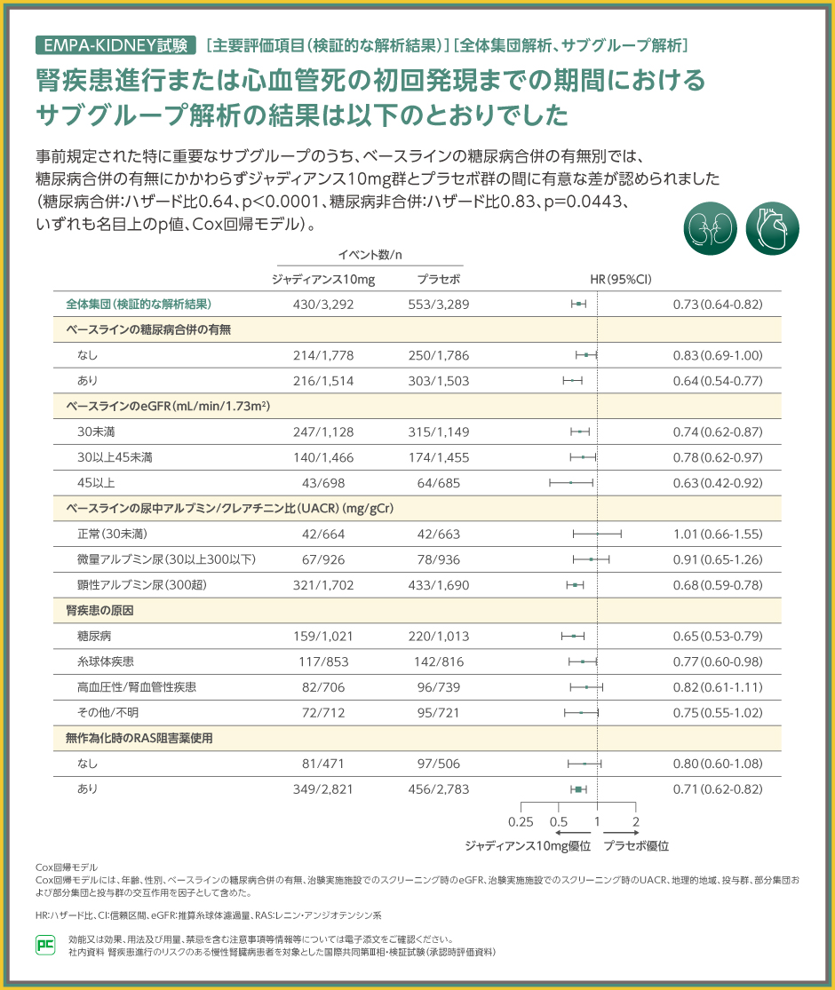腎疾患進行または心血管死の初回発現におけるサブグループ解析の結果、ベースラインの糖尿病合併の有無にかかわらずジャディアンス10mg群とプラセボ群の間に有意差が認められました(糖尿病合併:ハザード比0.64、p<0.0001、糖尿病非合併:ハザード比0.83、p=0.0443、いずれも名目上のp値、Cox回帰モデル)。