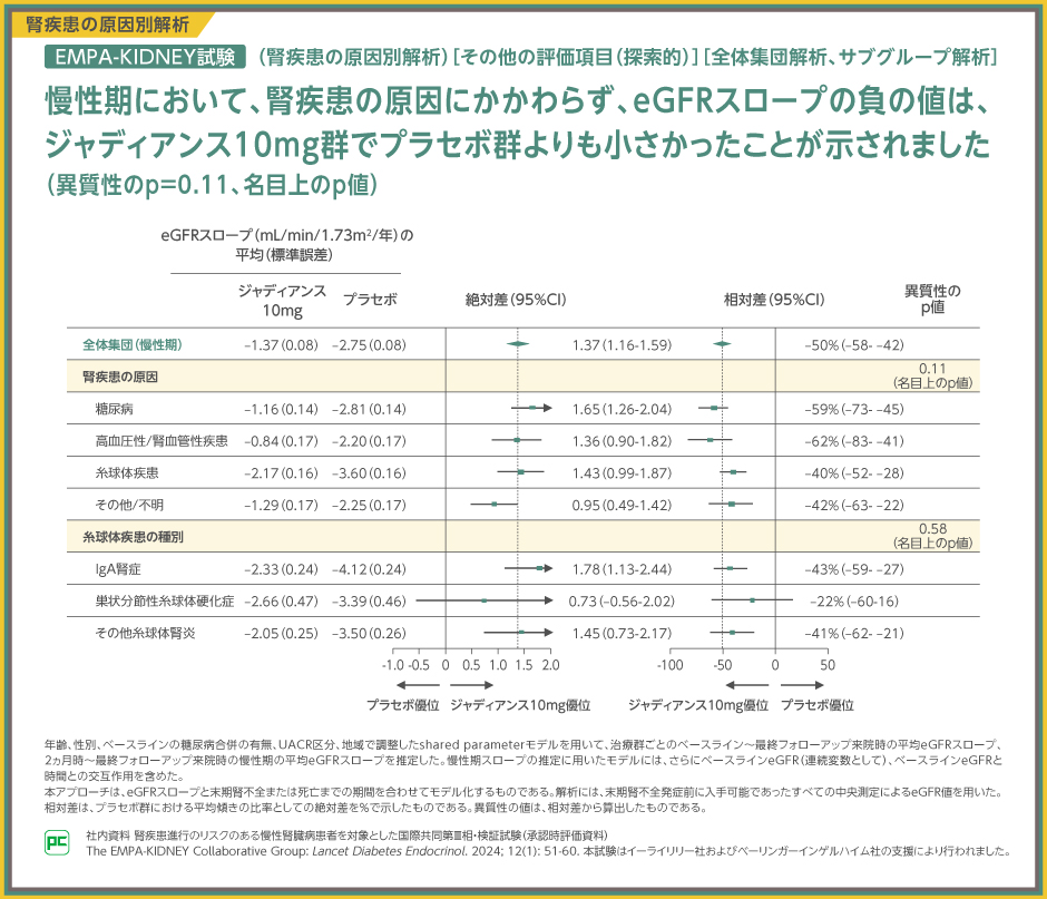 また、慢性期において、腎疾患の原因(糖尿病、高血圧性/腎血管性疾患、糸球体疾患およびその他/不明)にeGFRスロープを検討した結果、eGFRスロープの負の値はジャディアンス10mg群でプラセボ群よりも小さかったことが示されました(異質性のp=0.11、名目上のp値)。