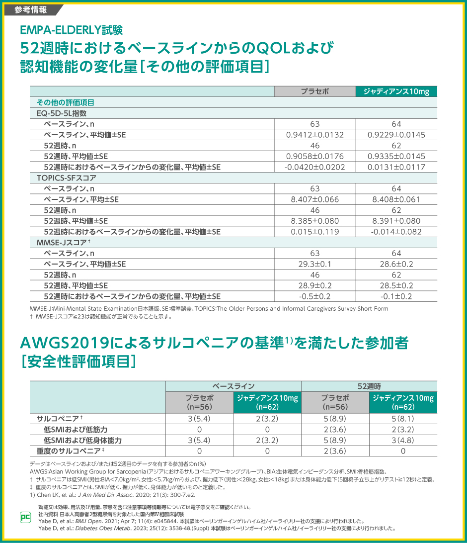 AWGS2019によるサルコペニアの基準を満たしたのは、ジャディアンス10mg群のベースライン時で3.2%(2/62例)、52週時で8.1%(5/62例)であり、プラセボ群ではそれぞれ5.4%(3/56例)、8.9%(5/56例)でした。