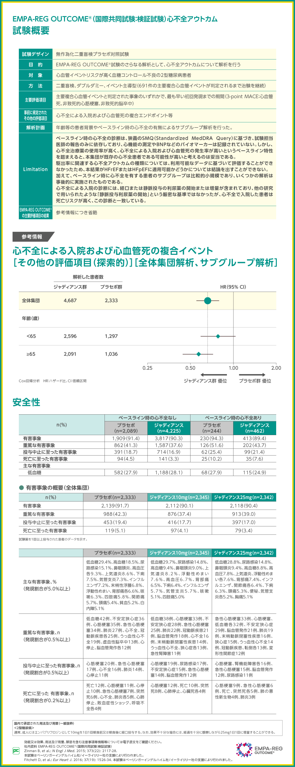 主な有害事象は低血糖で、心不全がある場合でプラセボ群27.9%(68/244例)、ジャディアンス群24.9%(115/462例)、心不全がない場合でプラセボ群27.9%(582/2,089例)、ジャディアンス群28.1%(1,188/4,225例)に認められました。