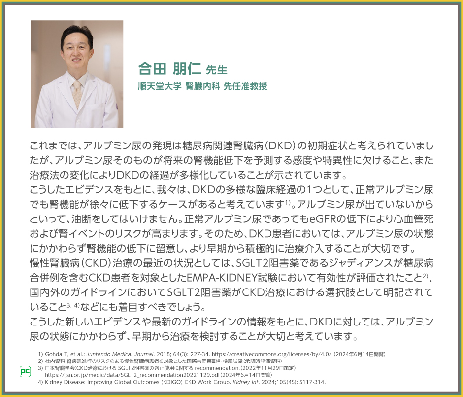 今回は監修の順天堂大学 腎臓内科 先任准教授の合田 朋仁先生とともに、多様化するDKDの臨床経過とそれに伴うCKD治療について考えます。