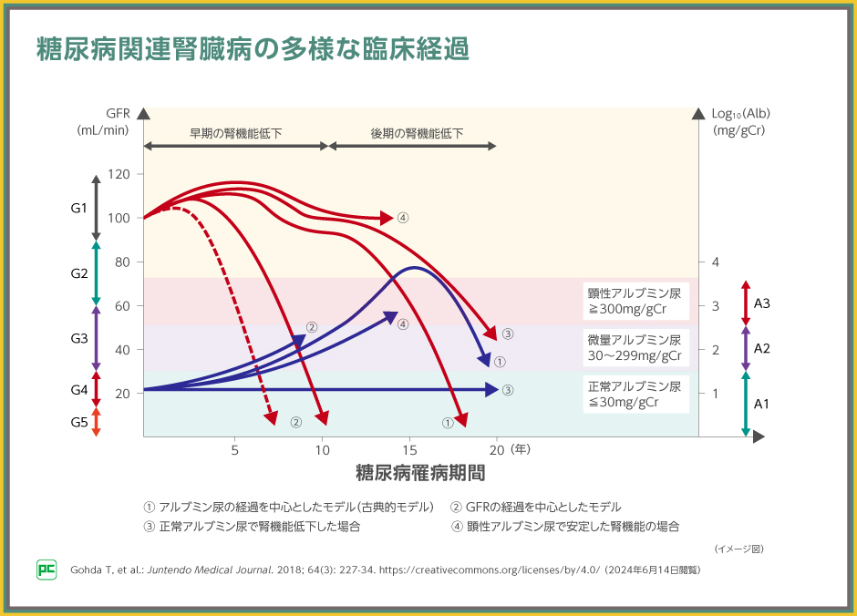 アルブミン尿の顕在化よりも前に腎機能の低下は進行していることがあると考えられています