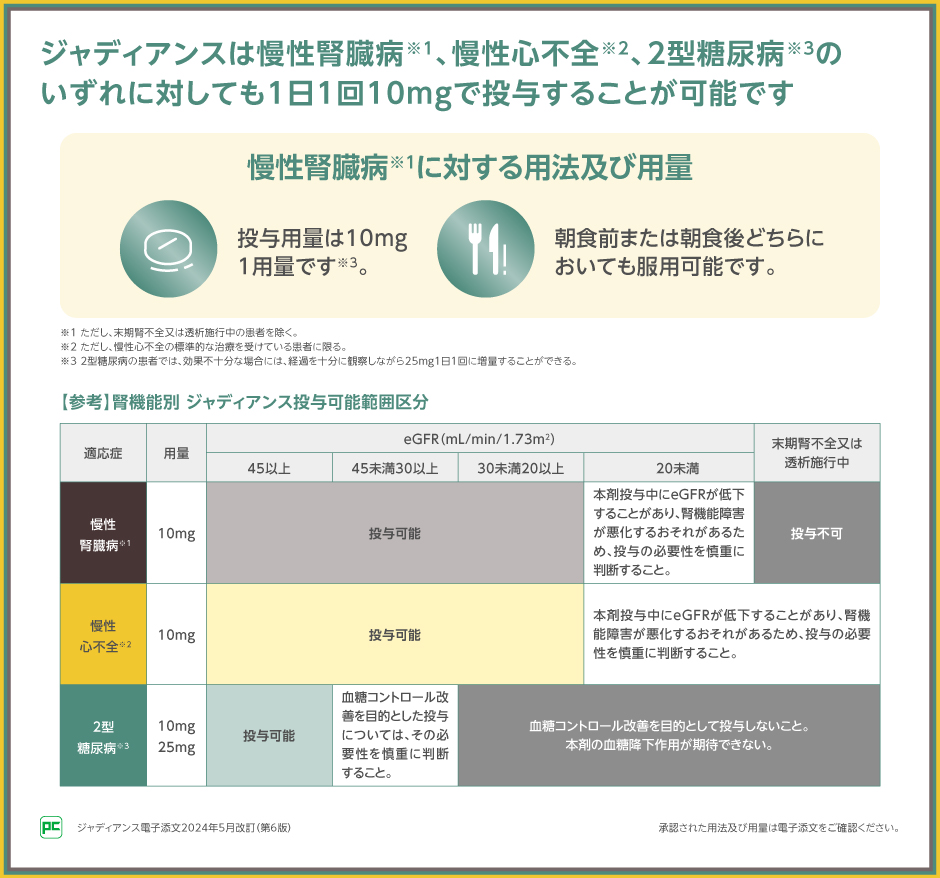 ジャディアンスの適応症は慢性腎臓病に加え、慢性心不全※2、2型糖尿病※3となっており、全ての適応症において10mgで投与することが可能です。