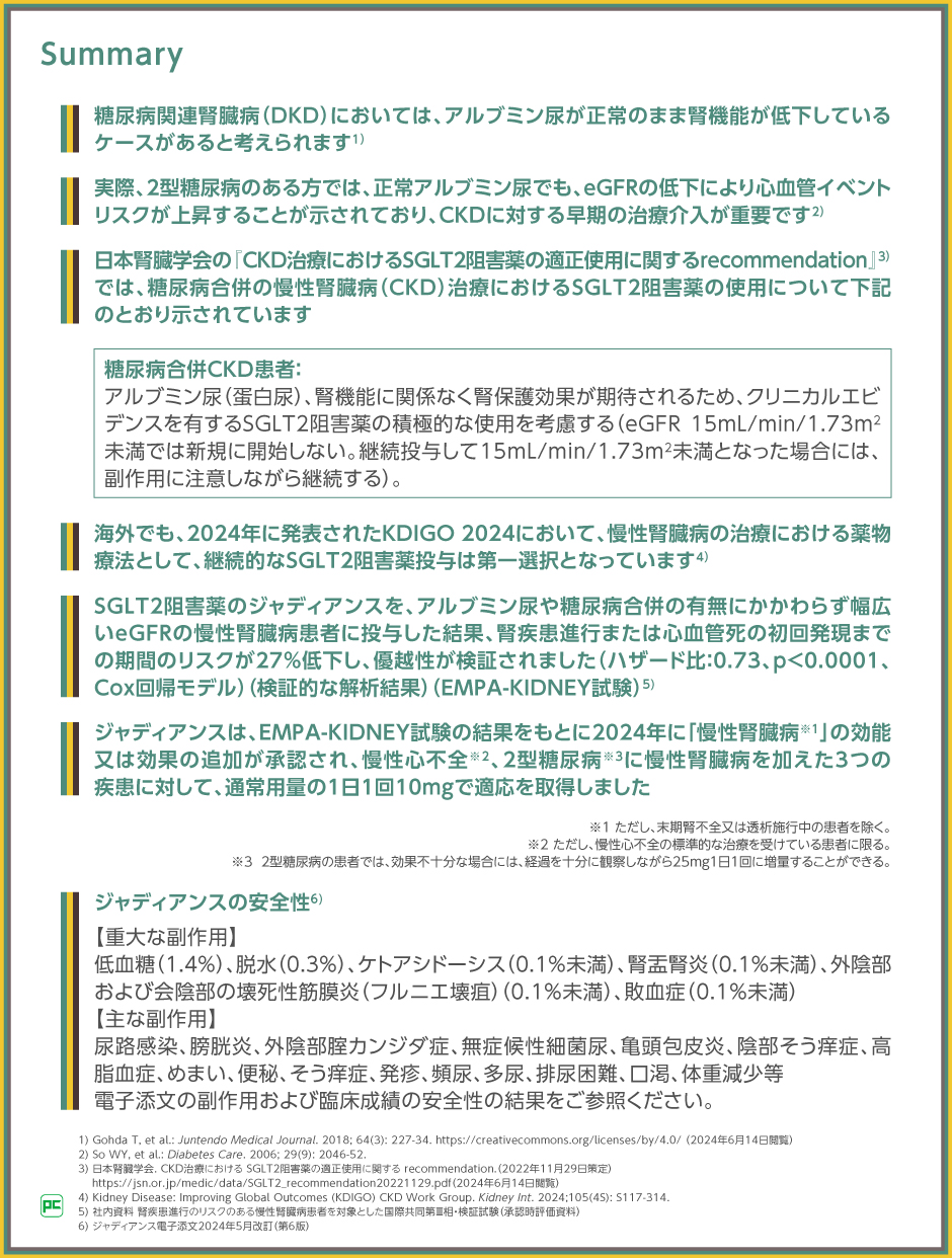 こうした状況から、新たな選択肢も含めて、2型糖尿病のあるCKD患者さんの最適な治療を考える機会となっているのではないでしょうか。