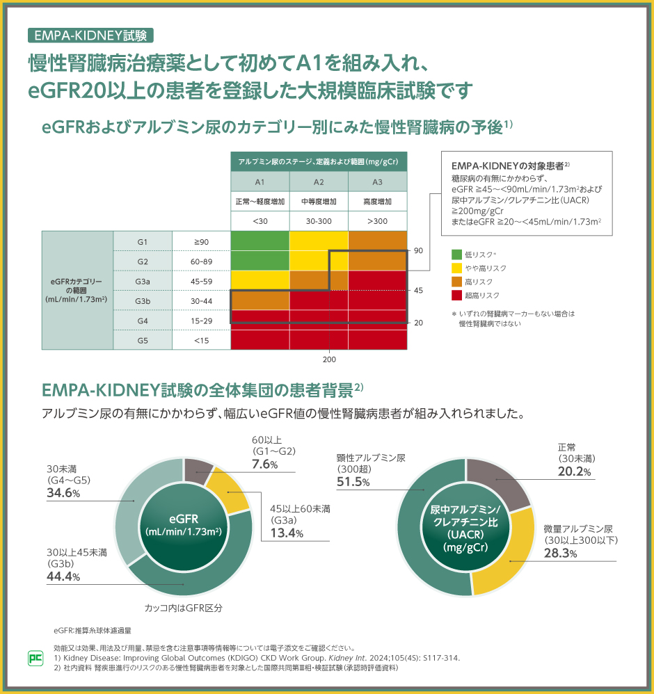その根拠となったEMPA-KIDNEY試験では、アルブミン尿や糖尿病合併の有無を問わず、幅広いeGFR値のCKD患者を対象に、有効性および安全性を検討しました。