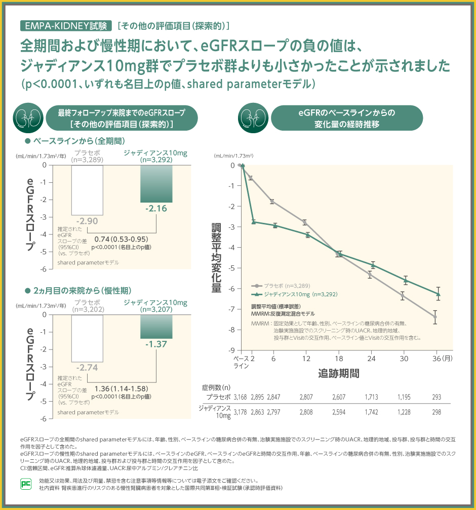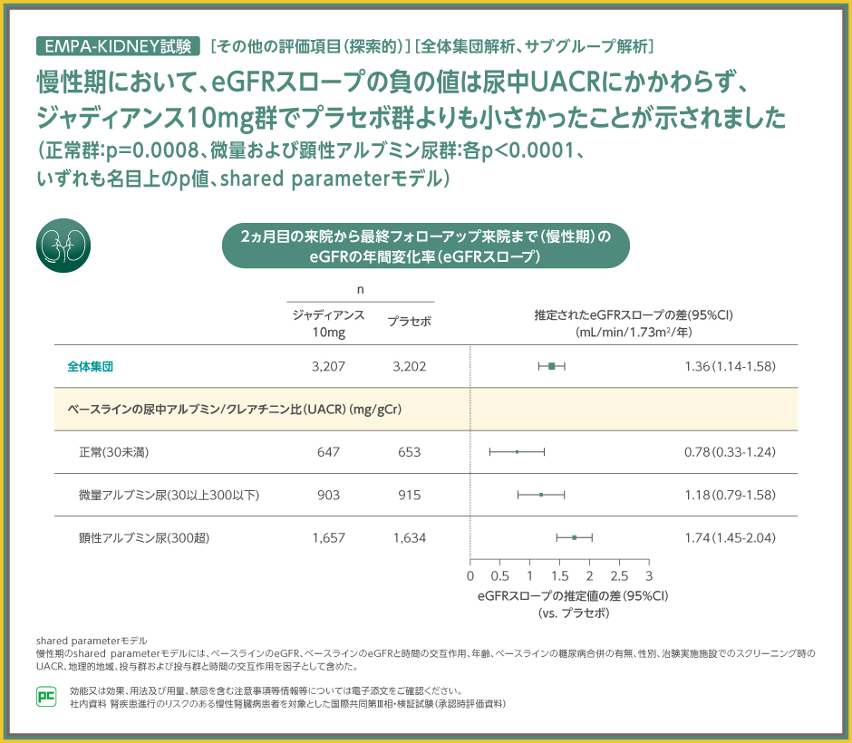 また、慢性期において、ベースラインのUACR別にみたサブグループ解析では、推定されたeGFRスロープの差から、ジャディアンス10mg群は正常群、微量アルブミン尿群、顕性アルブミン尿群のいずれにおいても、プラセボ群に対してeGFRスロープの低下が小さかったことが示されました(正常群:p=0.0008、微量アルブミン尿群および顕性アルブミン尿群:各p<0.0001、いずれも名目上のp値、shared parameter モデル)。