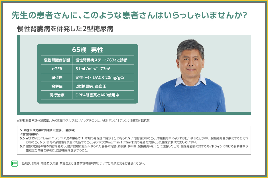 先生の患者さんに、図に示すような慢性腎臓病(CKD)を併発した2型糖尿病のある方はいらっしゃいますか?