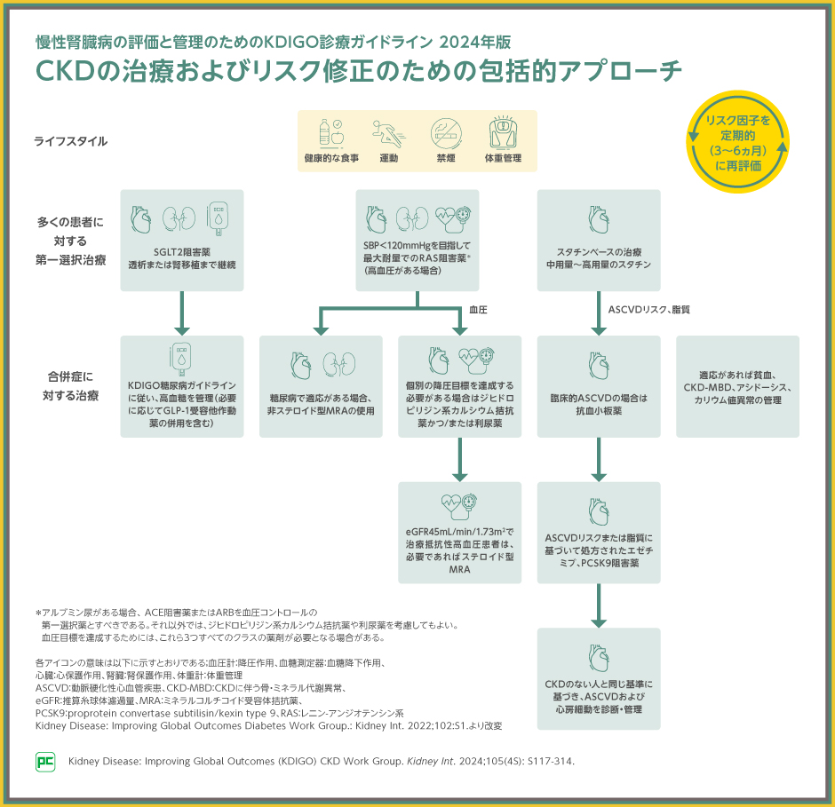 海外でも2024年に発表されたKDIGO 2024において、CKD治療の包括的アプローチとして、食事や運動、禁煙、体重管理などの生活習慣の管理をベースに、薬物療法を行う際、SGLT2阻害薬が第一選択薬となっています。