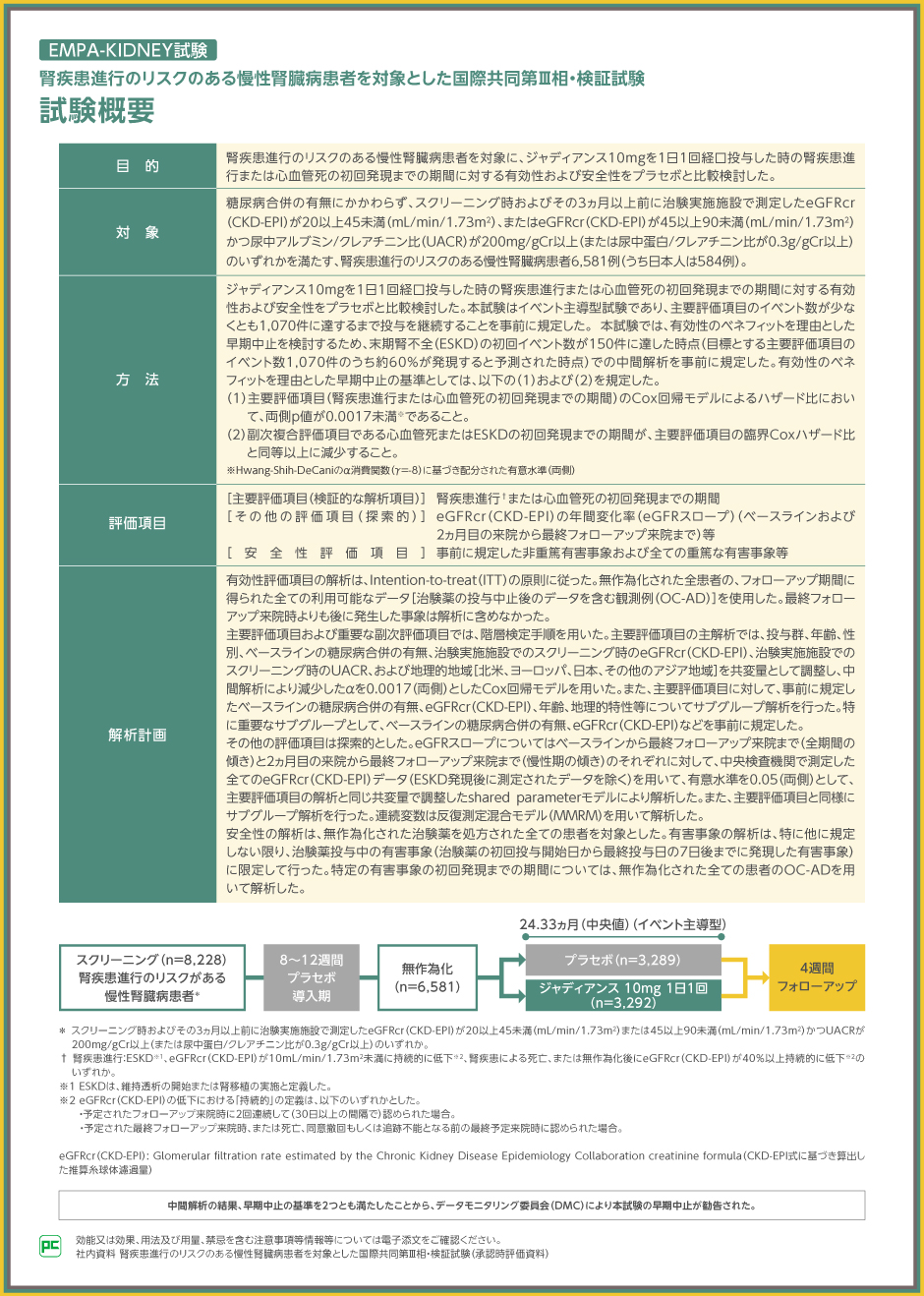 ジャディアンスは、EMPA-KIDNEY試験において糖尿病合併の有無を問わずCKD患者に対する有効性が示されました