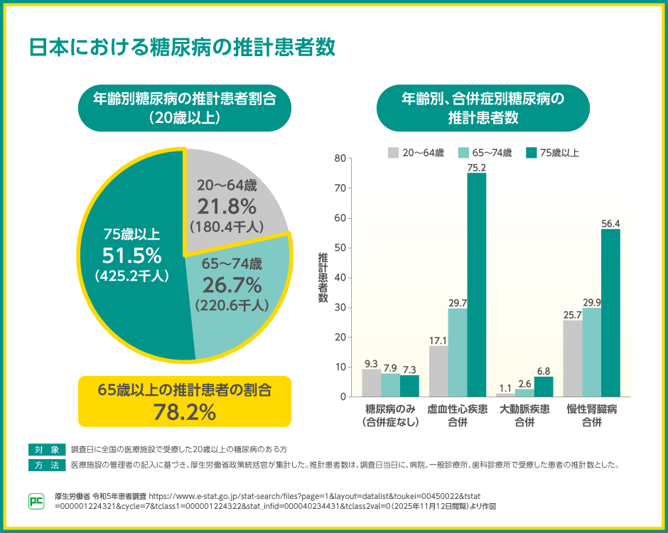 厚生労働省による患者調査では、糖尿病のある方の78.2%が65歳以上であると報告され、さらに、年齢が上がるほど、虚血性心疾患や慢性腎臓病を合併する患者さんの数が増えることが示されました。