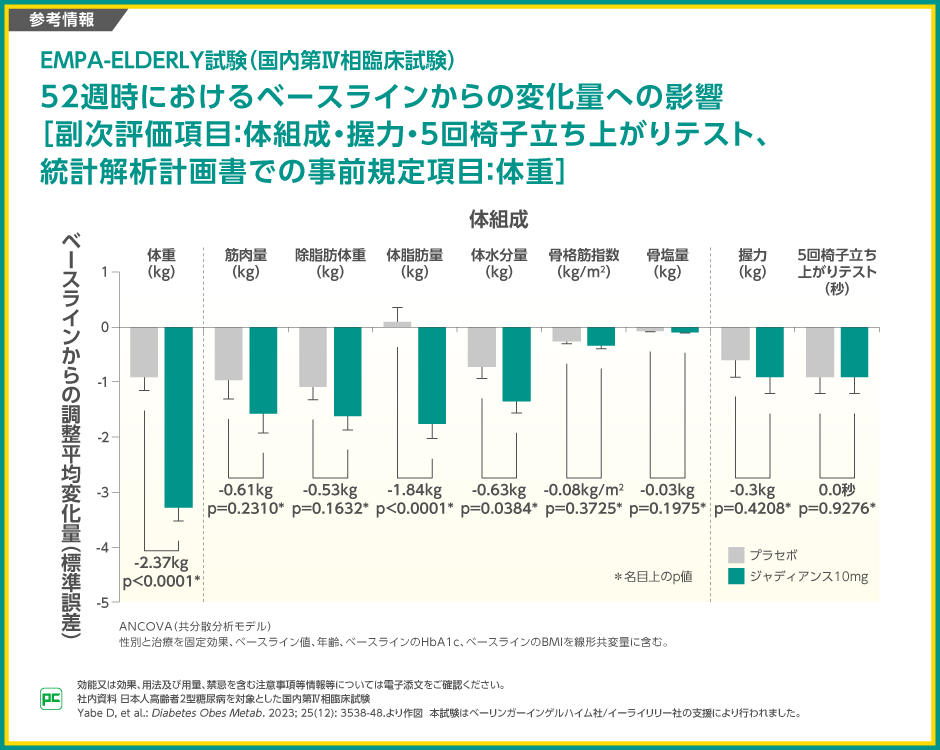 52週時のベースラインからの変化量の、ジャディアンス10mg群とプラセボ群の差は、体重が-2.37kg(p<0.0001)、筋肉量が-0.61kg(p=0.2310)、除脂肪体重が-0.53(p=0.1632)、体脂肪量が-1.84kg(p<0.0001)、体水分量が-0.63kg(p=0.0384)、骨格筋指数が-0.08kg/m2(p=0.3725)、骨塩量が-0.03kg(p=0.1975)、握力が-0.3kg(p=0.4208)、5回椅子立ち上がりテストが0.0秒(p=0.9276、いずれも名目上のp値、ANCOVA)でした。