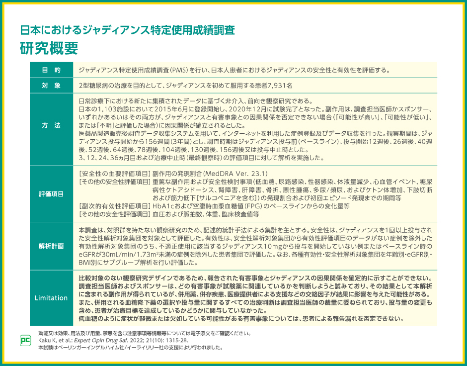 また、日本におけるジャディアンスの安全性を評価するため、特定使用成績調査が実施されました。