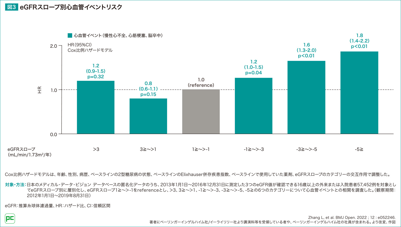 また、日本人を対象とした疫学調査では、eGFRスロープの傾きが急峻なほど、心血管イベントリスクが高くなることも報告されています10)(図3)。