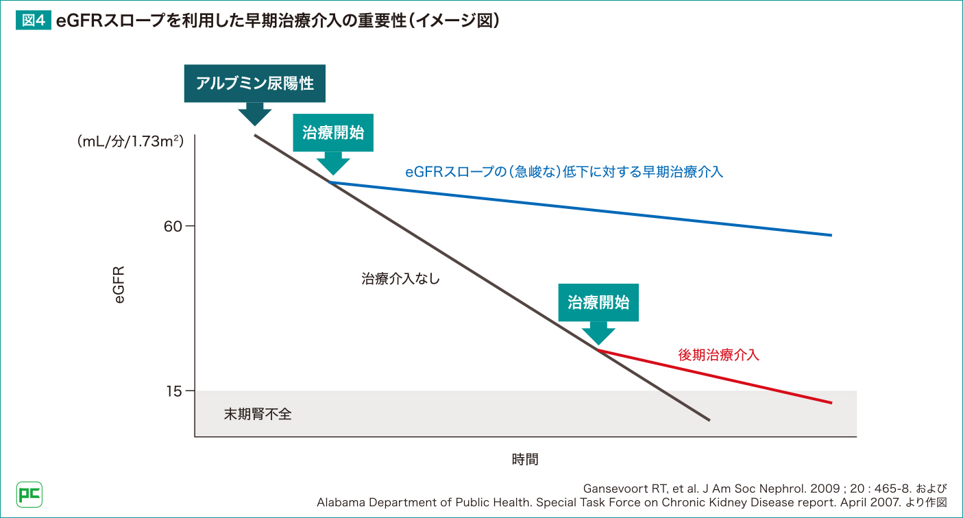 したがって、eGFRスロープを活用して急速な腎機能の低下を早期にとらえ、速やかに治療介入することでスロープの傾きを緩やかにし、透析などの腎代替療法の導入時期を遅らせたり心血管イベントリスクを抑制することが重要と考えられます(図4)。