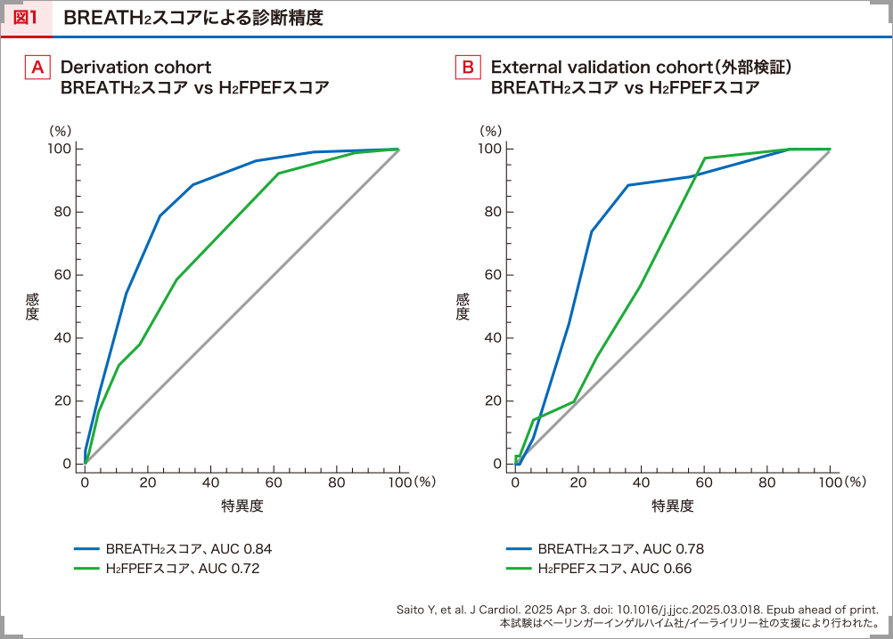 BREATH2スコアによる診断精度について検討するため、ROC曲線による解析を行いました。その結果、BREATH2スコアはHFpEF群と対照群を明確に区別し(曲線下面積[AUC]0.84)、H2FPEFスコアと比較しても優れた診断能力を示しました(AUC 0.84 vs 0.72、Delong法、p<0.0001)(図1A)16)。加えて、外部の検証として順天堂大学医学部附属順天堂医院の105例を対象に診断精度を検証したところ、同様にBREATH2スコアはHFpEF群と対照群を明確に区別しており(AUC 0.78)、H2FPEFスコアと比較しても優れた診断能力を示しました(AUC 0.78 vs 0.66、Delong法、p=0.02)(図1B)16)。