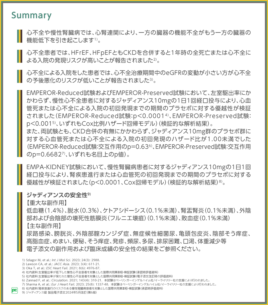 左室駆出率を問わず処方可能なジャディアンスには、EMPEROR-Reduced試験、EMPEROR-Preserved試験でのCKD有無別サブグループ解析に加え、CKDを対象としたEMPA-KIDNEY試験等のエビデンスがあります。