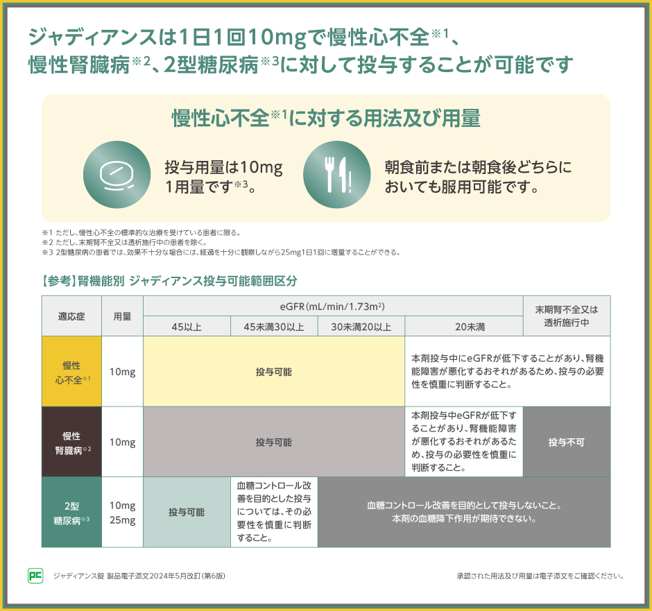 ジャディアンスは1日1回10mgで慢性心不全※1、慢性腎臓病※2、 2型糖尿病に対して投与することが可能です。